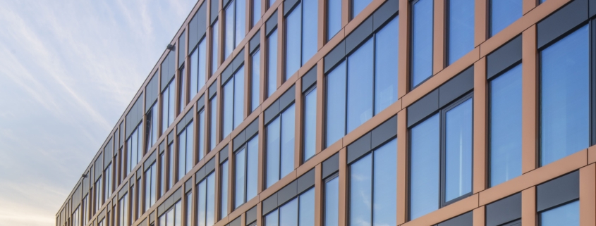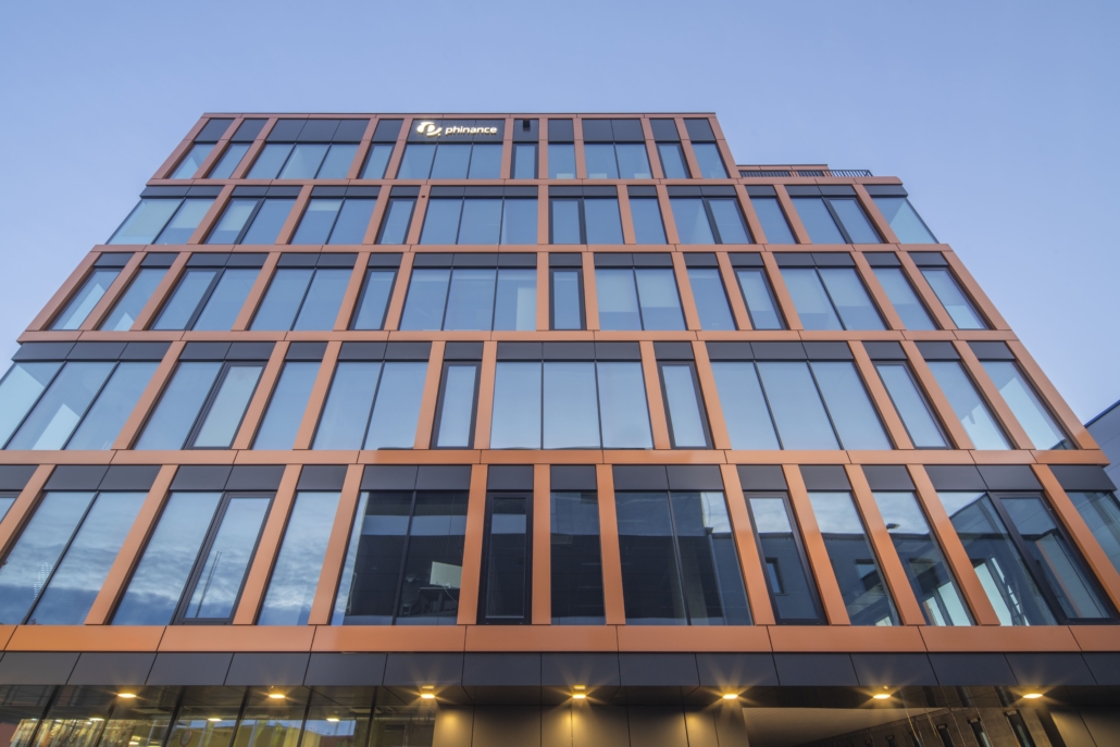 The final effect is a neutral, consistent façade aesthetic and parameters that meet contemporary office standards.
